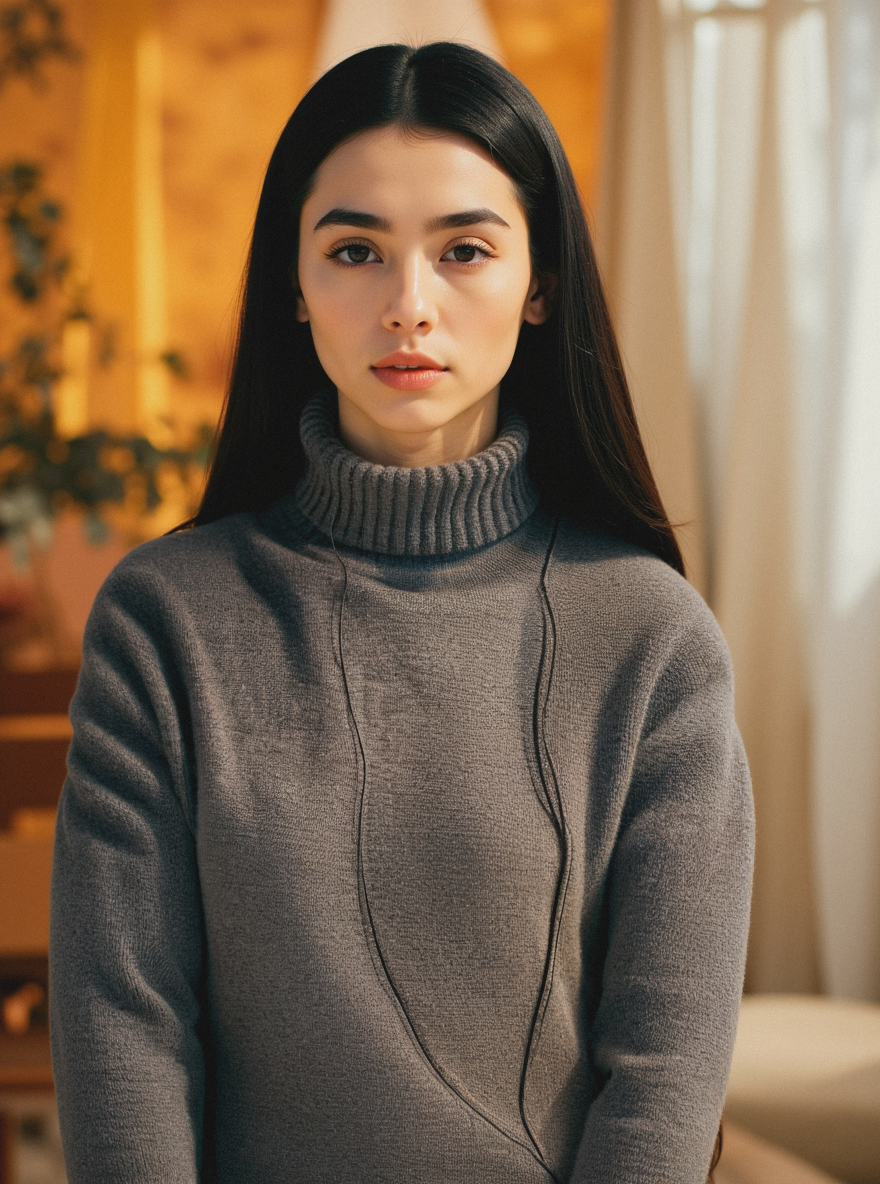 Lifestyle, portrait style, Middle Eastern adult female model, facing forward with head straight, arms down, symmetrical alignment. She has deep, expressive almond-shaped eyes, thick, well-defined eyebrows, high cheekbones, and a strong yet elegant jawline. Her dark, rich, sleek hair is neatly styled, and her expression is welcoming and composed. Wearing (gray turtleneck knit sweater, textured fabric, soft fit), suitable for an elegant, professional setting. Background is a cinematic loft with soft natural light, warm tones, shallow depth of field, and minimal style - evoking a welcoming atmosphere for a customer service role. Detailed skin texture, shot on Canon R5, Vogue photoshoot, unedited, raw, DSC_02.jpg, National Geographic, 2019 / Nikon D3400, 50mm, f/2.8.