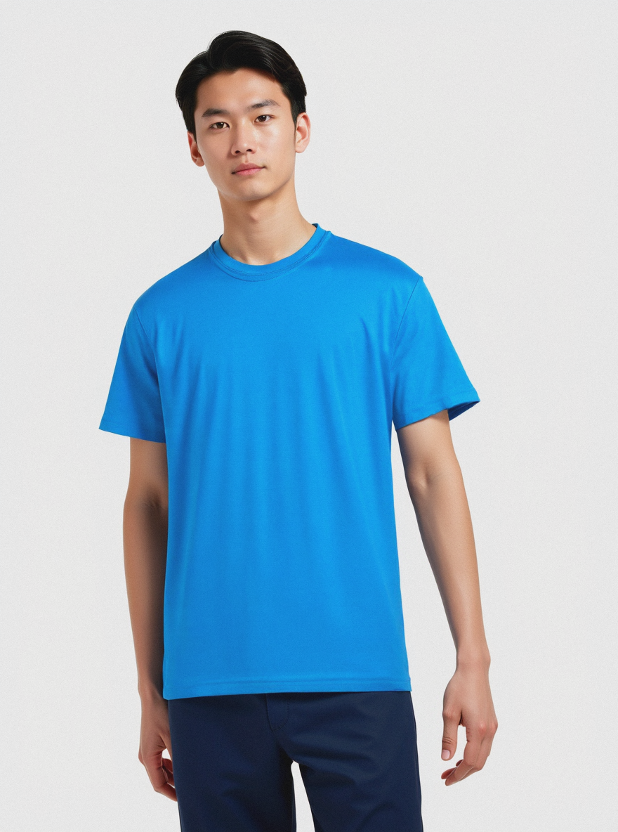 Minimalist, portrait style, adult Asian male model, almond-shaped dark eyes, high cheekbones, straight dark hair, standing front-facing with arms down and hands relaxed, head slightly tilted. Wearing (plain blue short-sleeve t-shirt, regular fit). Plain studio background, crisp lighting, detailed skin texture, sharp focus on facial features, clean and modern composition, high contrast. Shot on Canon R5, Vogue photoshoot, unedited, raw, DSC_02.jpg, National Geographic, 2019 / Nikon D3400, 50mm, f/2.8.