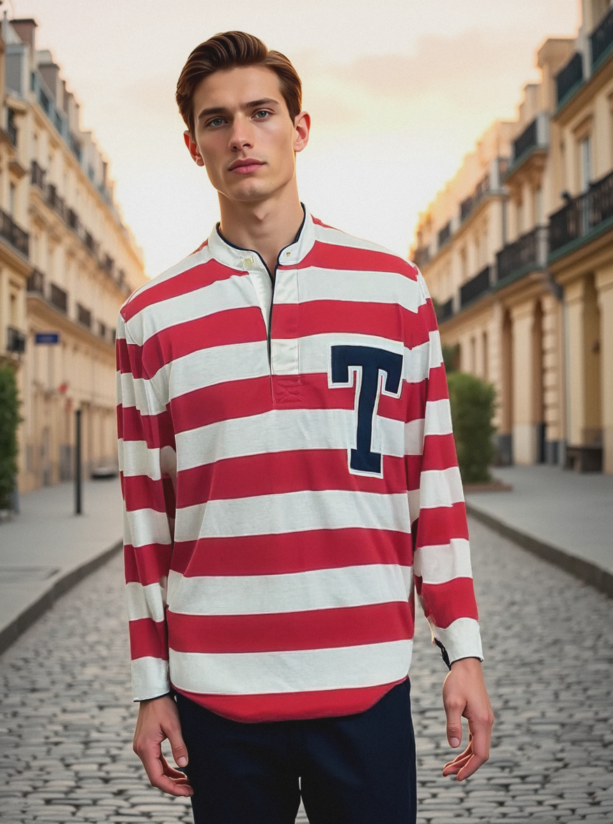 Lifestyle portrait, adult Western European male model with chestnut brown hair styled elegantly (straight), high cheekbones, and a defined jawline, fair skin with cool undertones. Standing front-facing, arms down, hands relaxed, head slightly tilted. Wearing (red and white striped rugby shirt, long sleeves, classic fit, cotton fabric, white collar). Background: a cinematic Parisian street at golden hour, cobblestone streets and elegant buildings with wrought-iron balconies, soft warm gradient in the sky from gold and soft orange near the horizon to pinkish-peach above, minimal yet unmistakably Parisian setting. Youthful style emphasized — Ảnh chân dung theo phong cách trẻ trung. Detailed skin texture, shot on Canon R5, Vogue photoshoot, unedited, raw, DSC_02.jpg, National Geographic, 2019 / Nikon D3400, 50mm, f/2.8.
