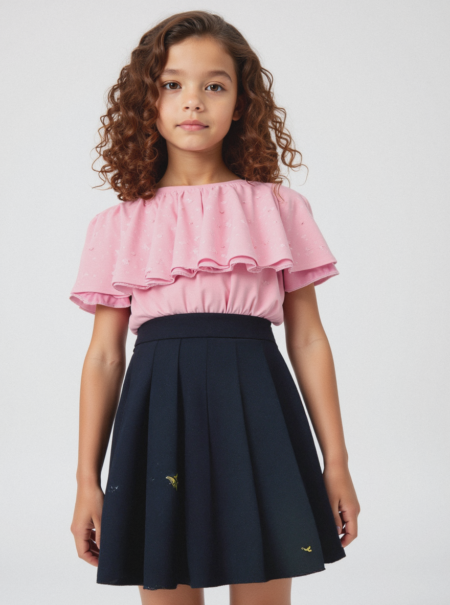 Minimalist, knee-up shot, Western European preteen female model, around 10-12 years old, with medium-length chestnut brown curly hair styled elegantly, soft facial contours, natural childlike proportions. Standing straight with a slim build, facing forward, arms down at sides, legs relaxed. Wearing (pink ruffled top, short sleeves, soft fabric, regular fit), (black skirt, high-waisted, above the knee, flared silhouette). Plain white studio background, high contrast, sharp focus, emphasizes simple and modern preteen fashion. Detailed skin texture, fair with cool undertones. Shot on Canon R5, Vogue photoshoot, unedited, raw, DSC_02.jpg, National Geographic, 2019 / Nikon D3400, 50mm, f/2.8.