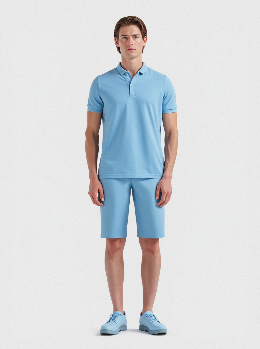Minimalist, knee-up shot, Western European male model with chestnut brown straight hair styled elegantly, high cheekbones, and a defined jawline, fair skin with cool undertones. Standing front-facing, arms down, hands relaxed, legs straight, head forward. Wearing (light blue polo shirt, regular fit, short-sleeve, buttoned collar), (light blue shorts, regular fit, above-the-knee length). Plain white studio background, clean composition, sharp focus, high contrast, detailed skin texture, shot on Canon R5, Vogue photoshoot, unedited, raw, DSC_02.jpg, National Geographic, 2019 / Nikon D3400, 50mm, f/2.8.