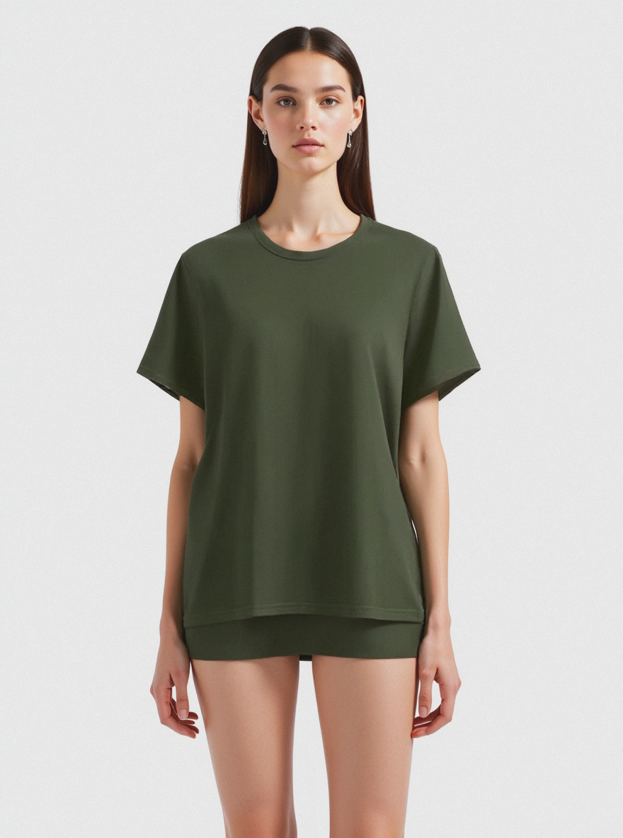 Minimalist, front-facing studio shot, adult female model, light skin tone, detailed skin texture, neutral expression, standing straight with arms relaxed at sides, legs straight, head facing forward, slender body shape. Wearing (plain olive green t-shirt, regular fit, short-sleeve, untucked). Plain white background, sharp focus, high contrast, clean and modern aesthetic, emphasis on simplicity and everyday style. Shot on Canon R5, Vogue photoshoot, unedited, raw, DSC_02.jpg, National Geographic, 2019 / Nikon D3400, 50mm, f/2.8.