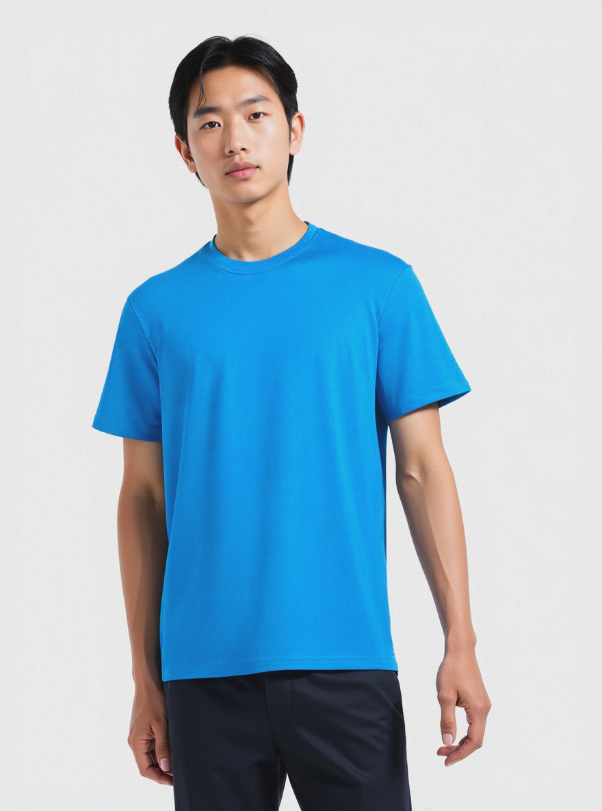 Minimalist, portrait style, adult Asian male model with almond-shaped dark eyes, high cheekbones, and straight dark hair, standing in a front-facing pose with arms down, hands relaxed, head slightly tilted. Wearing (plain blue short-sleeve t-shirt, regular fit). Plain white studio background, soft and crisp lighting, high contrast. Detailed skin texture, shot on Canon R5, Vogue photoshoot, unedited, raw, DSC_02.jpg, National Geographic, 2019 / Nikon D3400, 50mm, f/2.8.